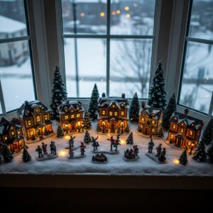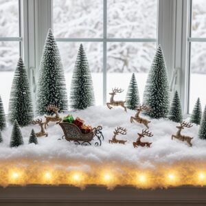 Cover the window ledge with a layer of faux snow and arrange small decorative elements like reindeer, miniature trees, or tiny sleighs.