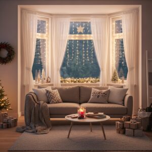 Combine them with sheer white curtains to diffuse the light and create a soft, ethereal effect that enhances your living room’s festive atmosphere.