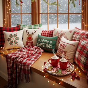 5. Set Up a Cozy Window Seat with Christmas Pillows