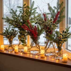 Arrange fresh pine branches, holly leaves, and red berry stems in vases or jars along the window sill.