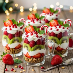 Layer Greek yogurt with granola and festive fruits like pomegranate seeds, strawberries, or kiwi.