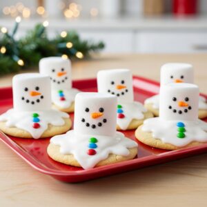 Place half a marshmallow for the snowman’s head, add chocolate dots for buttons, and draw a carrot nose with orange icing.