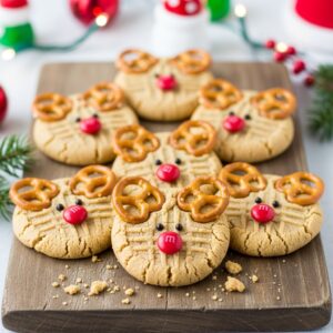 Press the dough into circles, add pretzel “antlers,” chocolate chip “eyes,” and a red candy “nose.”