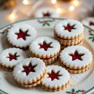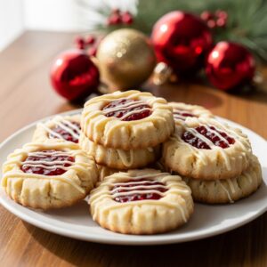 Create a buttery shortbread base, press each cookie center with your thumb, and fill it with raspberry jam before baking.