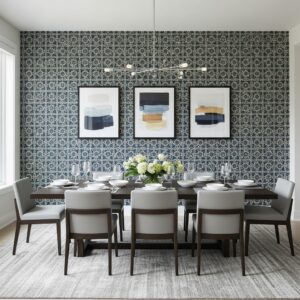 A statement wall works best behind the dining table, anchoring the room and giving it a sophisticated touch.