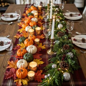 In fall, bring in pumpkins and warm-toned table runners; in winter, layer the space with greenery and twinkling lights.