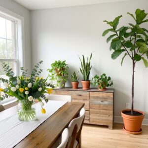 Greenery softens the room’s atmosphere and pairs beautifully with both modern and traditional decor styles.