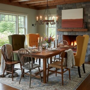 Consider pairing upholstered chairs with wooden benches or alternating different colored chairs around the table.