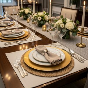 Layer table runners, placemats, and stylish dinnerware to elevate your dining experience.