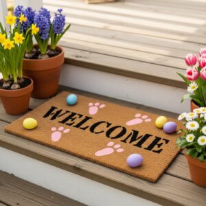 Choose a stylish Easter‑themed welcome mat featuring simple phrases like “Hop In” or bunny footprints.