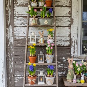 Lean a weathered wooden ladder against the porch wall and use its rungs to display potted spring flowers, small lanterns, and Easter bunnies.