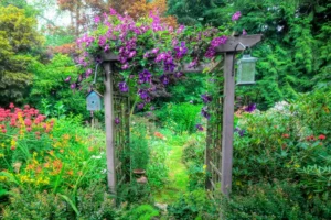 If your flower bed space is small, use vertical space by adding a pergola. Plant climbing flowers like bougainvillea, clematis, and mandevilla around it. As they grow, they’ll cover the pergola with beautiful blooms and give you more privacy in your yard.