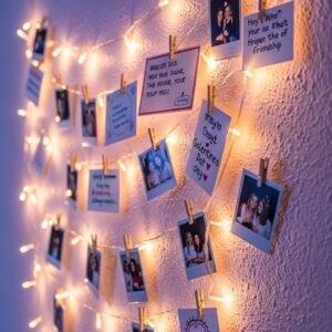 Add ambiance with string lights and hang friendship notes, mini cards, or Polaroids along them.