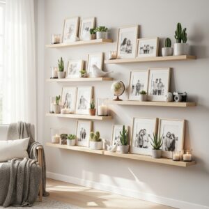 Floating shelves aren’t just functional—they can showcase small keepsakes, candles, and framed photos.