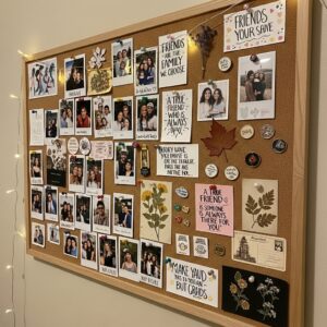 Hang mini clothespins on a string or use a photo grid to clip pictures, making your wall a rotating gallery of friendship moments.