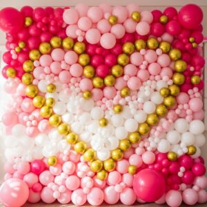 For a party vibe, create a wall full of balloons in shades of pink, white, and gold.