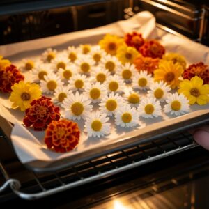 Line a baking tray with parchment paper and arrange flowers in a single layer.