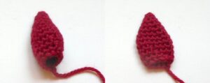 2. Fold the petal up along the centre line, so the two ends of the open edge meet. Using a yarn needle and the long yarn end, make a couple of stitches at the open edge between the two ends, to keep them together.