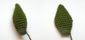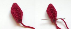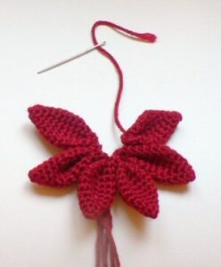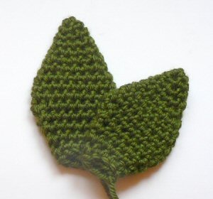 3. Use a yarn needle and the long yarn end from one of the leaves to stitch them together, joining the two leaves with small stitches at the end and about a third of the way up the leaves.