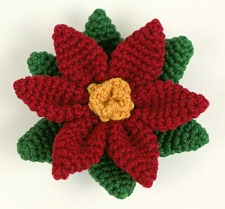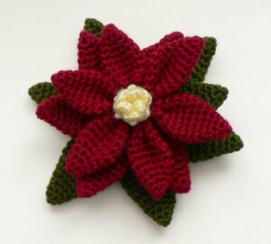 Crochet a large poinsettia flower for Christmas – perfect as a table centrepiece or as a decoration. Or make a smaller one in fine yarn or thread to wear as a pin on your coat, a Christmas tree decoration, or anything else you can think of!