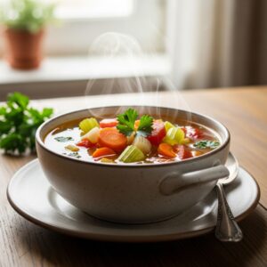 A comforting mix of fresh vegetables in a light broth, this classic vegetable soup is packed with nutrients and flavor while being extremely low in calories.