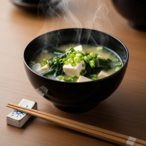A traditional Japanese soup, miso soup is low in calories yet full of umami flavor, enriched with tofu and seaweed.
