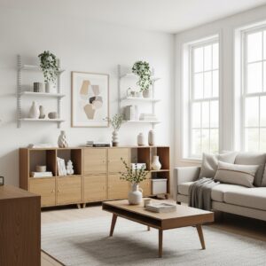 Modular storage units that can adapt to different layouts are perfect for small or multifunctional living rooms.