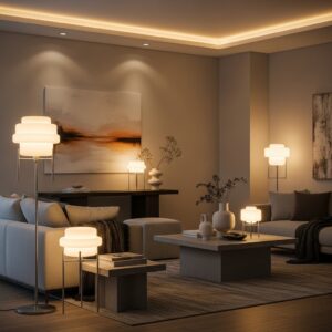 Beyond ceiling lights, consider floor lamps, table lamps, or wall-mounted fixtures with minimalist designs.