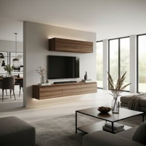 Floating cabinets or wall-mounted consoles reduce floor clutter and create a sense of space.