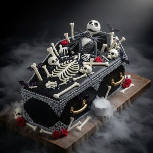 Decorate it with edible bones, black fondant, and a mini Jack or Oogie Boogie figure “popping” out of the top.
