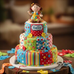 Sally’s dress is full of colorful, stitched-together fabric patches—perfect inspiration for a layered cake.