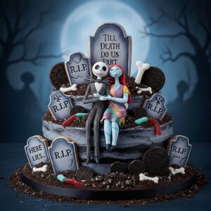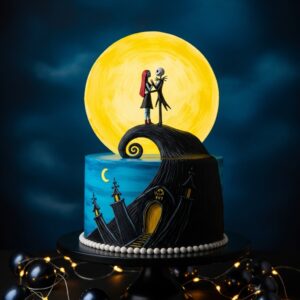 For couples or themed parties, a romantic Jack and Sally cake makes a stunning centerpiece.