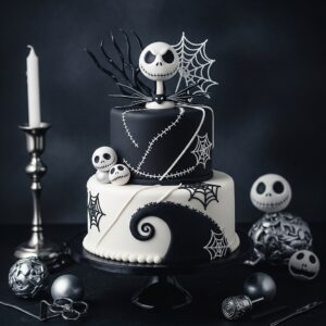 If you prefer something classy and dark, a black-and-white Nightmare Before Christmas cake is perfect.