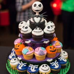 If you prefer smaller desserts, a Nightmare Before Christmas cupcake tower is both fun and easy to serve.