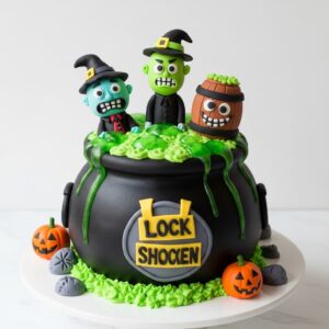 Use bright colors and caricature-style fondant figures of Lock, Shock, and Barrel climbing or peeking out of a cauldron-shaped cake.