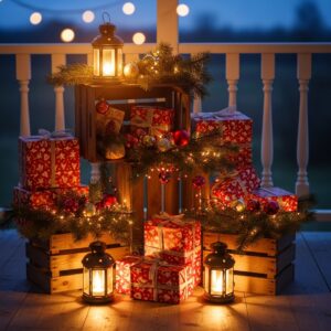 Stack wooden crates near your porch or entryway and fill them with holiday greenery, pinecones, ornaments, and wrapped “gift” boxes.