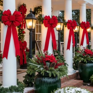 Oversized bows on porch railings or gates create a grand, elegant effect.