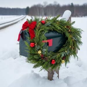 Dress up your mailbox or garden post with garland, ribbon, and pine branches.