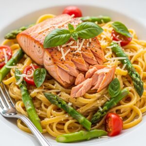Salmon is packed with omega-3 fatty acids, protein, and essential nutrients, while pasta adds a satisfying base that makes the dish filling.
