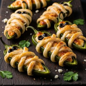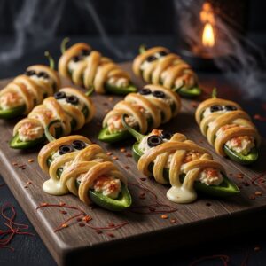 Each jalapeƱo is filled with creamy, cheesy goodness, wrapped in golden-brown crescent dough, and decorated to look like mini mummies.