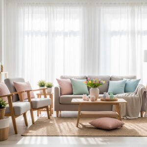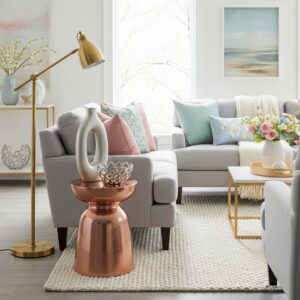 A blush pink armchair, a mint coffee table, or a soft yellow ottoman adds a playful spring touch without overwhelming the room.