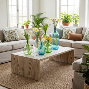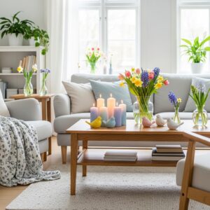 For spring, think decorative vases with fresh flowers, ceramic birds, or pastel-colored candles.