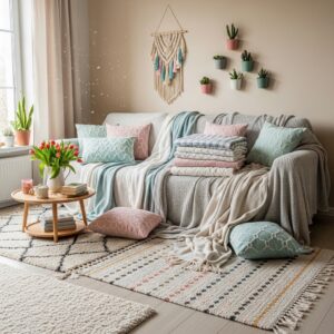 Mix soft throw blankets, patterned cushions, and textured rugs to create a cozy yet chic atmosphere.