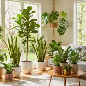 Indoor plants like fiddle leaf figs, snake plants, or monstera add life and improve air quality.
